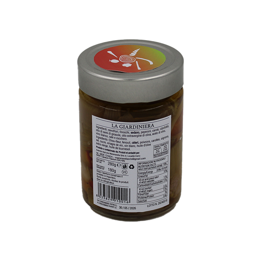 Ingredienti: Cavolfiori, finocchi, sedano, peperoni, carote, cipollotto, olio di semi di girasole, olio extravergine di oliva, aceto di vino, vino bianco, sale e zucchero.