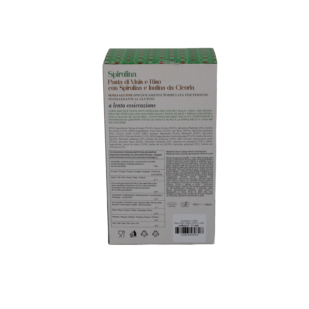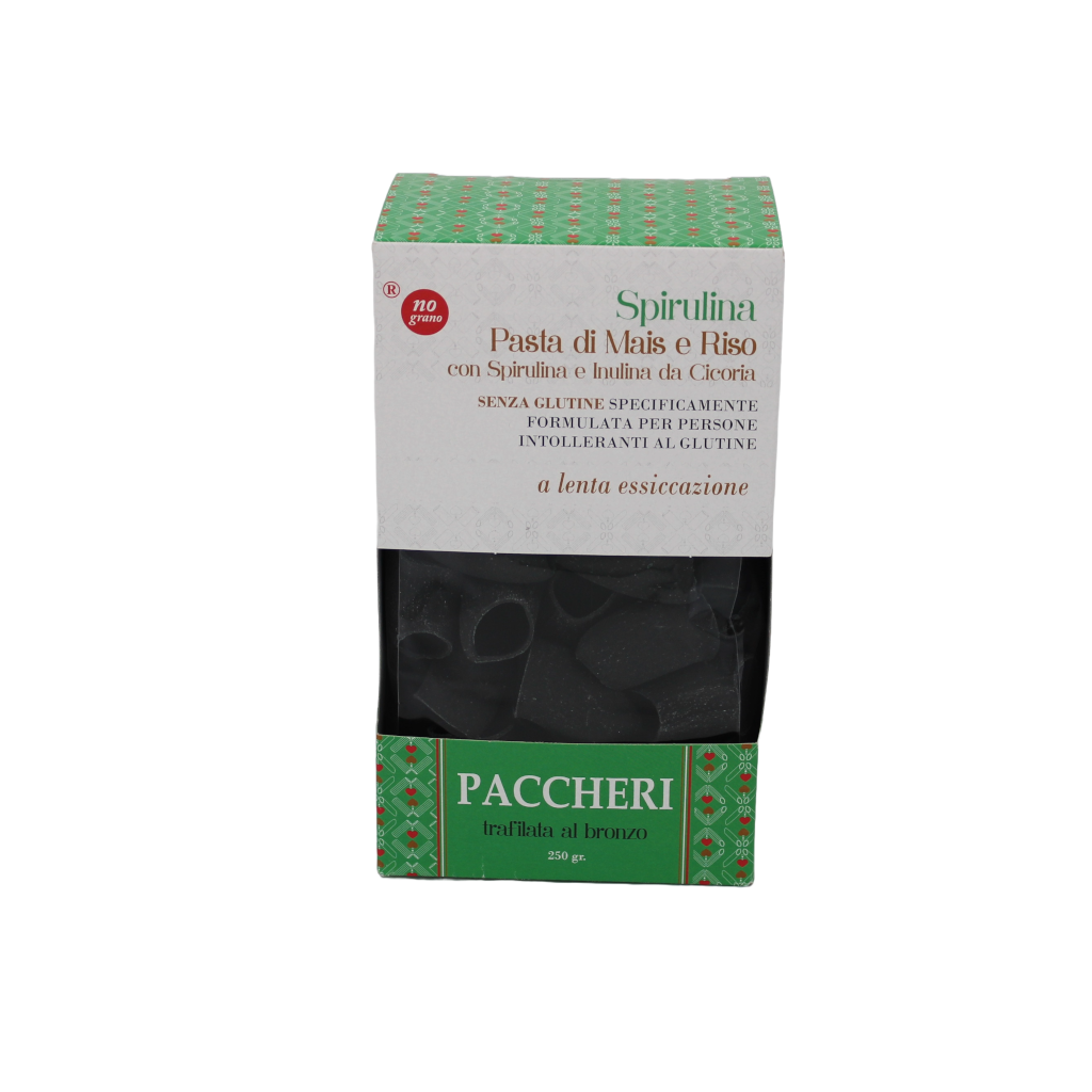 La linea Pasta di Mais e Riso con Spirulina è una pasta secca Senza Glutine, ottenuta dal mais bianco, mais giallo, riso e Spirulina Platensis e Inulina da cicoria.